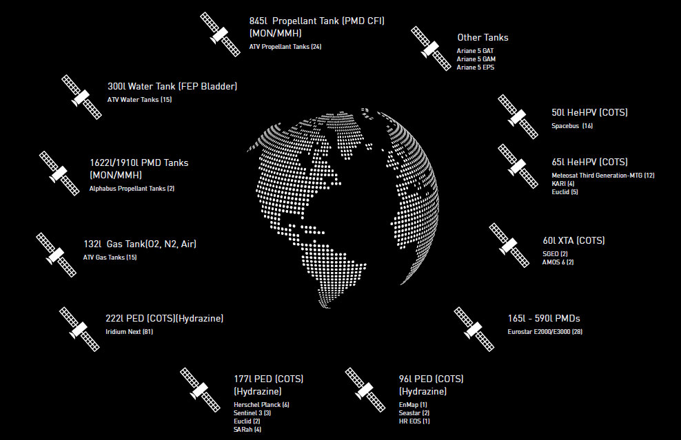 Electric propulsion tanks (EP) and high-pressure vessels (HPVs). Electric propulsion tanks are mainly designed and built for xenon applications and HPVs for helium or nitrogen usage. Full design authority lies with MT Aerospace.
