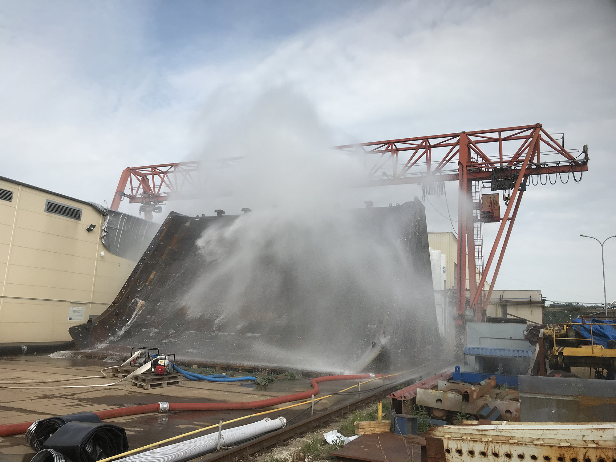With the successful completion of factory acceptance testing and function testing of the fully preassembled deflector, a further important milestone towards the completion of the launch facilities for the new launch vehicle has been reached. The deflector is a 500-ton steel structure with an integrated water cooling system. During the launch phase, it splits the vertical exhaust jet of the engines and diverts it into the two side exhaust ducts. It is cooled with 1.5 cubic meters of water per second so that it can withstand the enormous temperatures.