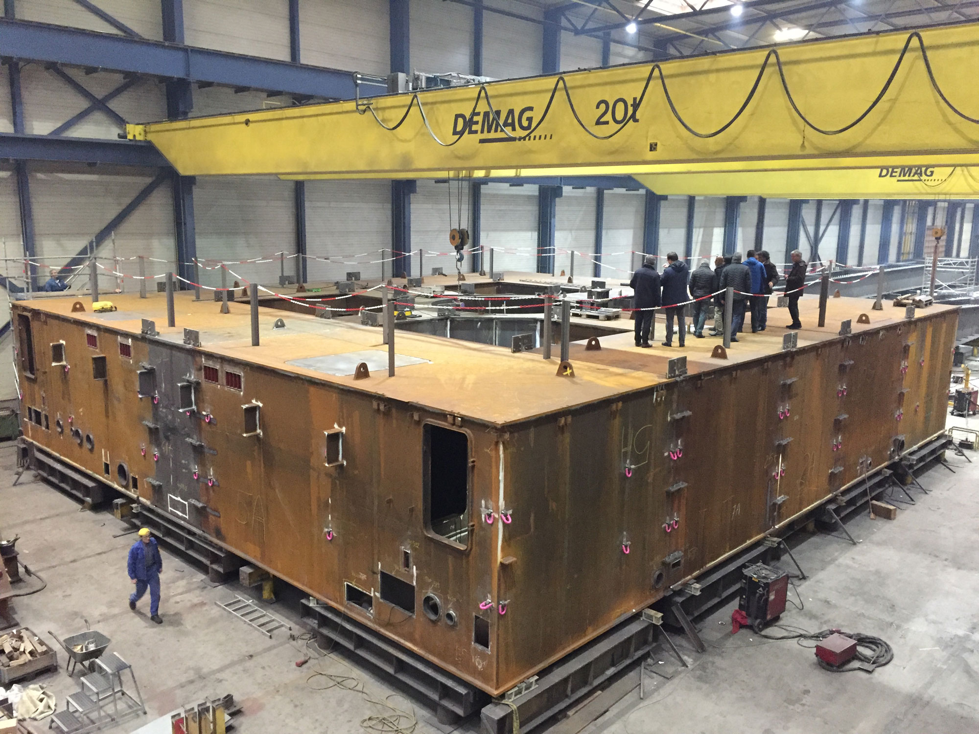 Der Starttisch ist gefertigt und wurde letzte Woche im Werk abgenommen. Sein Transport zum Startplatz ist für Anfang 2018 vorgesehen. Die ersten Mastteile für den Versorgungsturm sind bereits unterwegs nach Kourou.
